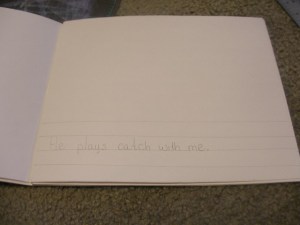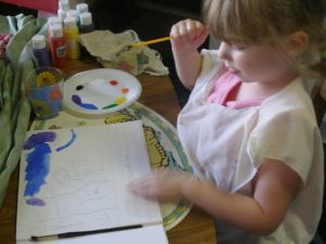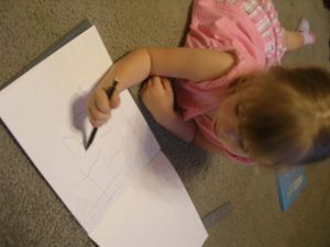 I had this idea at Christmas but saved it for Father’s Day. I wanted Jillian to make him a book, telling him “Why I Love My Daddy…” Jillian really wanted to paint the book, I have been telling her all week that we would paint. Today she asked Jeff to paint and almost blew our surprise. So I had to let her paint today, otherwise she would be asking all weekend. I made the book out of 5 sheets of posterboard 9 1/2″ wide and 22″ long and had Jillian tell me 11 things she loves about her daddy. I wrote each of the 11 things on a separate page and had her illustrate each page.