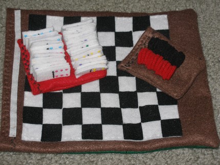 Here is the Checker Board with checkers and dominoes. I have modified the bags a little bit I added ribbon instead of the Velcro to close everything because I thought it would keep it closed better and a little bit better presentation. The inside pocket still has a Velcro closure and there are two little pockets (one for dominoes and one for checkers) with Velcro closures.