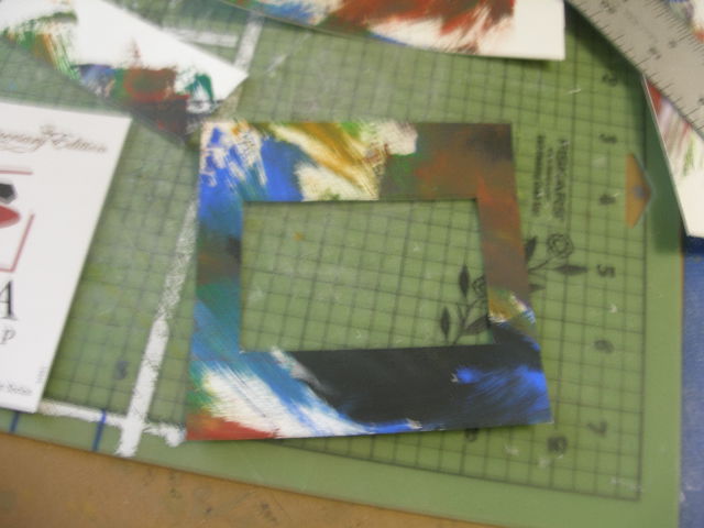 Cut out the center of the square with an Exacto Knife and metal ruler.