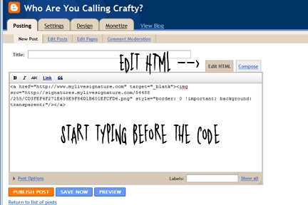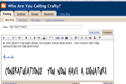 I really wanted to add a signature to my blog but I really thought it was a huge pain to even attempt it.  Well I finally did it through My Live Signature, I still have no idea why I wanted to do it I think because everyone else has one so I wanted one.  (Why, yes mom, I will jump off that bridge if everyone else is doing it.)  I do get confused fairly easily when it comes to HTML (HARDER THAN MAKING LOLLIPOPS) it is a whole new language that my simple mind refuses to learn.  I have tried several times to learn HTML to no avail primarily because Blogger and other programs I use have the nice compose feature that makes everything look pretty and no <a> or <break>, I have committed certain things to memory such as <center> I hate when things aren’t centered!  But that is all I have learned with it comes to HTML.