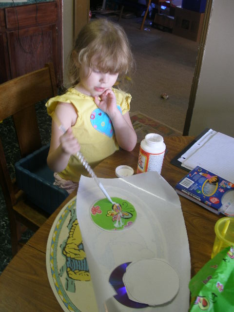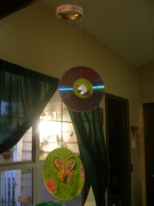 I have been saving old DVD/CD for a while now (because I think I will actually use them for something.) It finally dawned on me what to do with those things – Wind Chime! I went through my sewing kit because I also had some metal bobbins from my old sewing machine (I just couldn’t bring myself to get rid of them because I knew eventually I would find a use for them.) This project is a little labor intensive but my daughter had a blast helping me make it. Also 95% of the stuff was going to go in the trash so you can call this a “green” wind chime. I also had everything else so the price tag on this project ZERO!