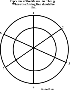 | Diagram I made on how to place fishing line and where to place CDs at 1 and 4 and the bobbins at 2,3,5, & 6. |