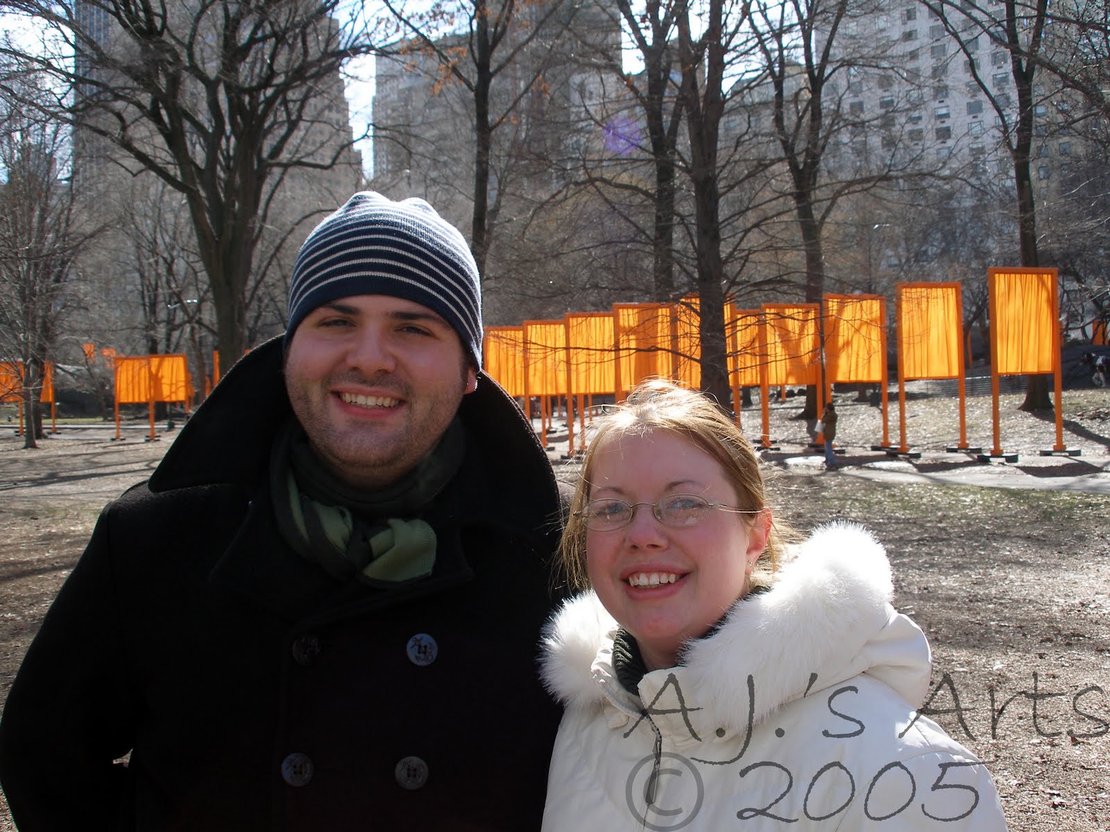 I then moved away to go to art college and learned about all the dead white men there have been and a couple of women artists. I then went to another college to study art education and learned that there have been women artists all along, which I knew, but it was nice to be told that it wasn’t just a bunch of dead white guys creating art all those years. One of the classes I had to take was a Modern Art class. (At the time I thought Modern Art was one step above an elephant painting, actually I would have said the elephant had more talent.) I was not a fan of Modern Art. My impression of Modern Art was – it was all crap! Little did I know I would have a Professor who would not only change my mind but also change my life. I kept a very open mind during her class and learned more in one class than I had in 4 years of art college. Then a couple people in my class talked about the “new” Christo and Jeanne-Claude exhibit in New York (The Gates) and I decided I needed to go. I wasn’t married, I had no kids, and it was a great reason to go to New York and see my best friend Todd. Christmas Break from college we (Jeff and I) went to Virginia to visit his parents (and to show my beautiful engagement ring!). Jeff wanted to take me to the Chrysler Museum and I was amazed at all the pieces they had. My favorite was a Nam June Paik. I was speechless and really excited. The story Jeff loves to tell is me telling Ken (my now father in law) about the Nam June Paik and he was trying to be so polite about the fact he didn’t have a clue what I was talking about.