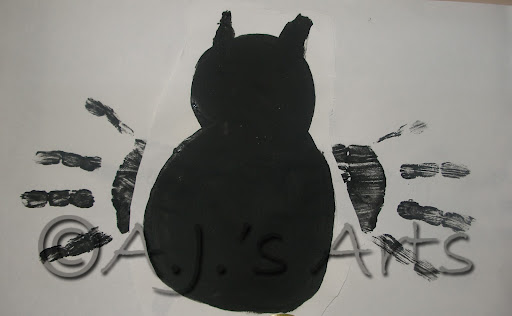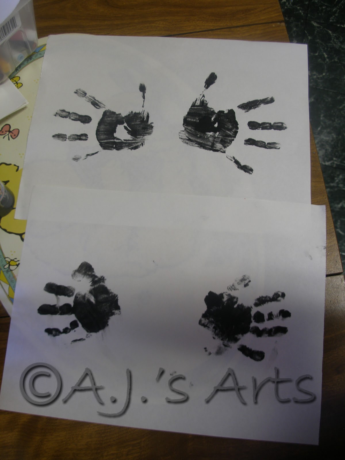Put black paint onto the paper plate. Take sponge brush and apply black paint to the child’s hand (one at a time) place child’s hand onto white paper. Repeat with the other hand. Take the other sheet of white paper and draw the head and body of the bat. Allow to dry, cut out and apply to the hand print page with glue stick. Decorate as desired.