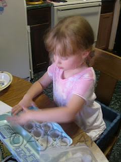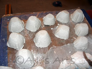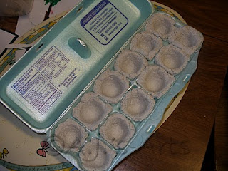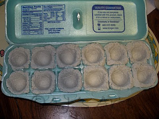 | We rolled out one inch balls of clay and then created pinch pots in the the egg carton. |