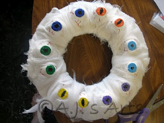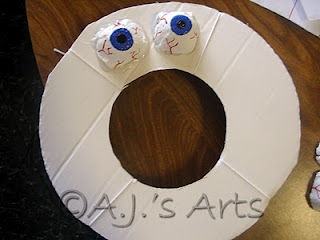 | I then tied the cardboard to the wreath and hot glued the eyeballs to the cardboard |
