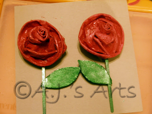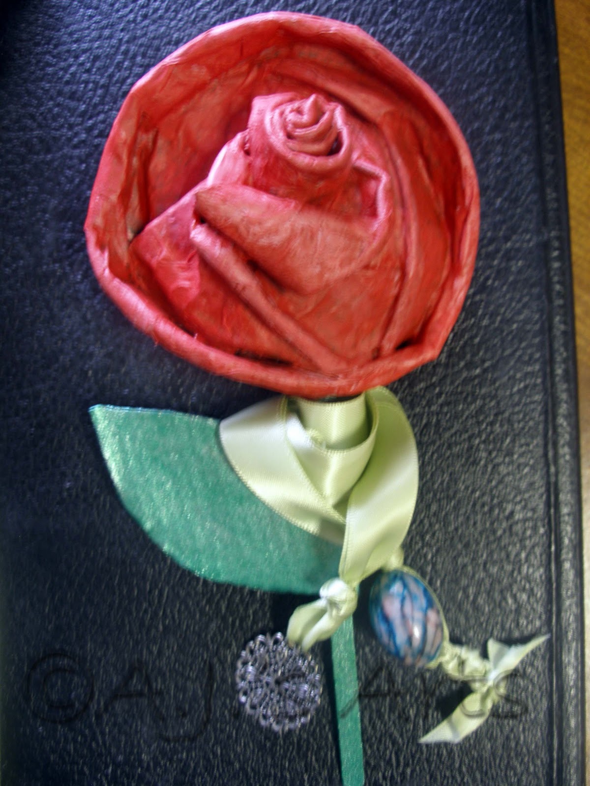 I made two flowers, one for each teacher, one cup was a little damp and it was easier to bend and shape than the dry one. I also rolled the interior part of the rose like a ribbon rose twisting the paper as I went. I also decoupaged pink tissue paper (Mod Podge) to the flowers it helped with the painting.