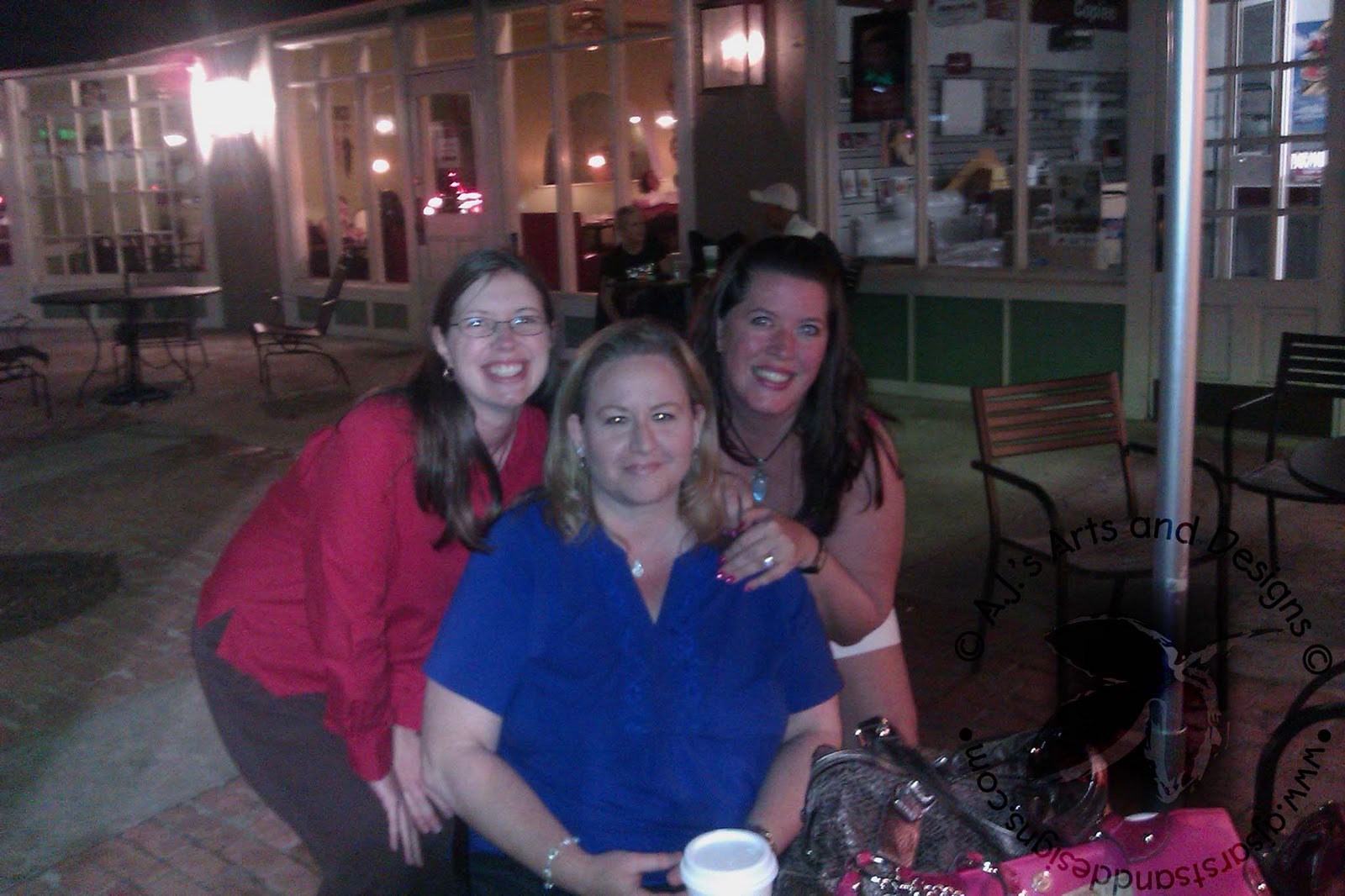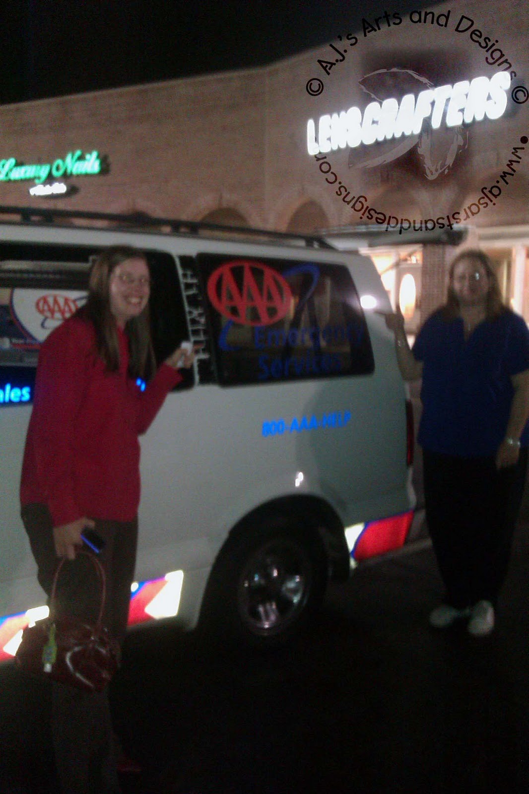 We went out for Sushi, ice cream at Cold Stone Creamery (Pistacho Jell-o Pudding the BEST THING EVER!) Starbucks and then we were pulling out of the parking lot and heard a thud-thud. Our response to each other, “What was that?” We all got out and checked the tires and we had a flat (or a soon to be very flat tire). Michelle called her husband, Terri laughed saying mine is in bed, I called Jeff – Jeff said, “Did you call AAA? That is why we pay for it.” I called AAA and they were there within 30 minutes. Tim (Michelle’s husband) arrived at the same time as AAA. We laughed about it and thought it was fitting to have that happen. I am pretty sure Tim thought we had all been drinking but none of us had any drinks, we were just having so much fun all we could do was laugh (and take pictures for Facebook).