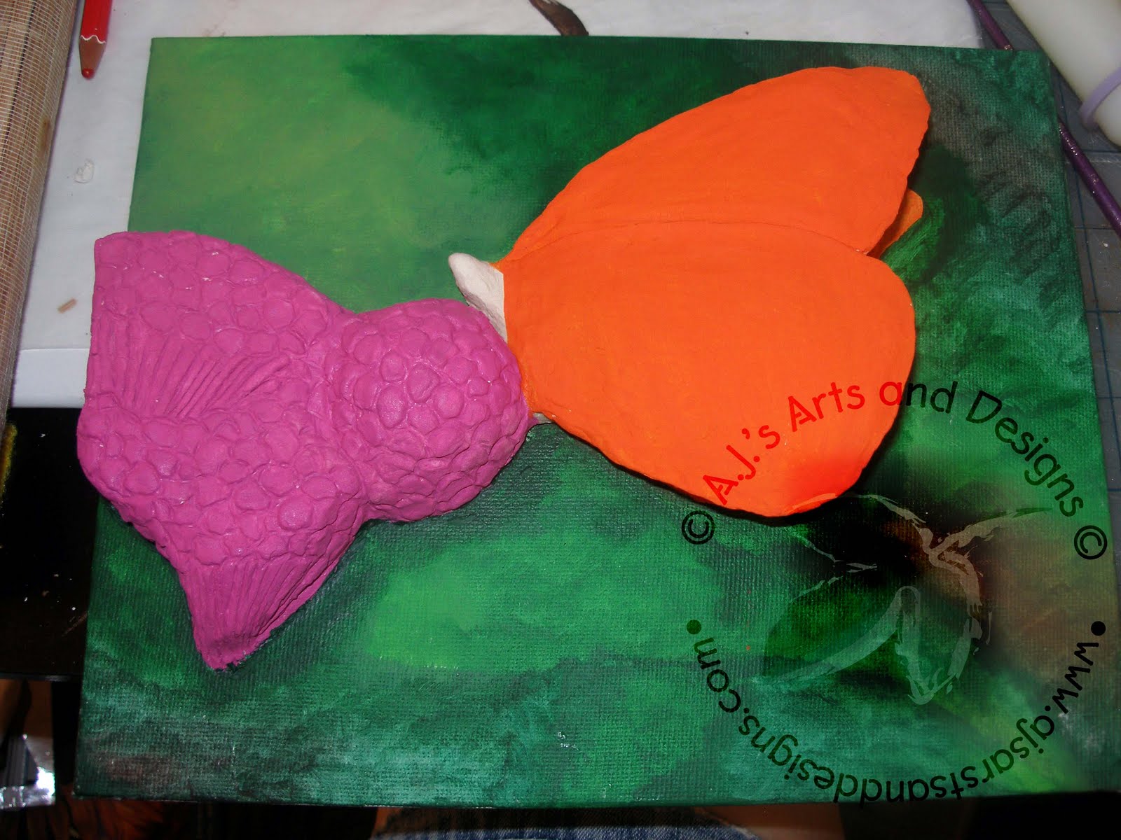 I also made progress on both the Fairy and the butterfly. Since my mom is here she has been great help telling me what is wrong with my fairy (no fingers and basic definition). I also worked some more on the butterfly painting, the butterfly did have an accident my daughter decided that it needed help flying so she broke the wing. After a small breakdown on my part I was able to easily fix the wing. I hope to have some more photos soon. If not everything will be up on Friday, so if you don’t here from me for a couple days that is why… wish me luck that I finish everything 🙂