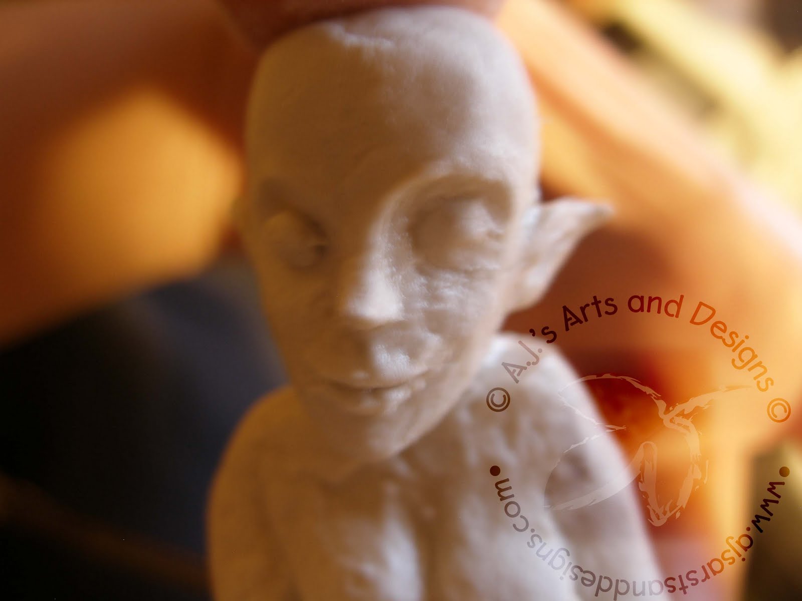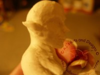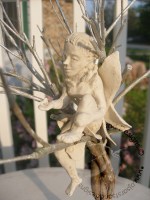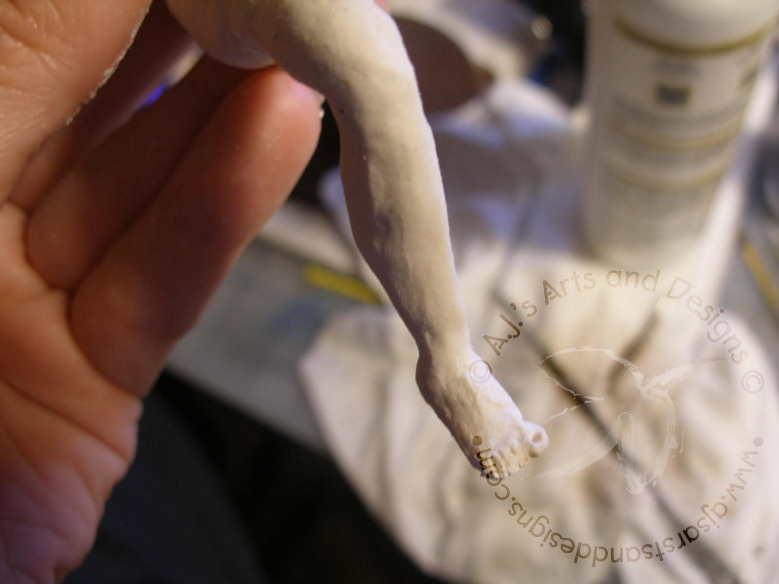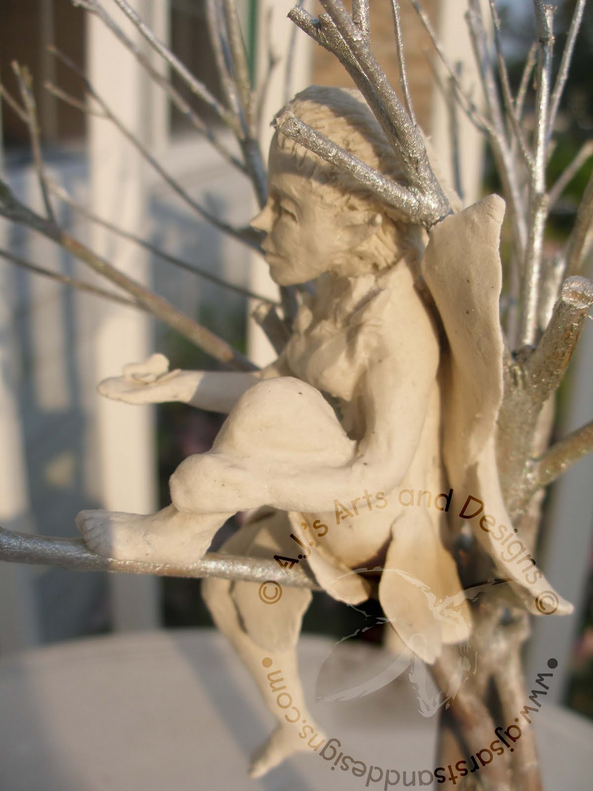 Since this project is for a Design Team, I took the Fairy outside before painting her so I could get some better photos of my progress. This was so I could show the detail of the Fairy. I found the Paperclay very easy to work with. It is very similar to an earthenware clay (without the work). I mentioned earlier that the Paperclay was extremely easy to use even if it was dried. I carved into the hand after it had dried because I did not sculpt detail originally. I tried to paint the detail and it did not look right, so I carved into it with an Exacto knife and curved sculpting tool to form fingers. I then added water to smooth it out and it worked perfectly.