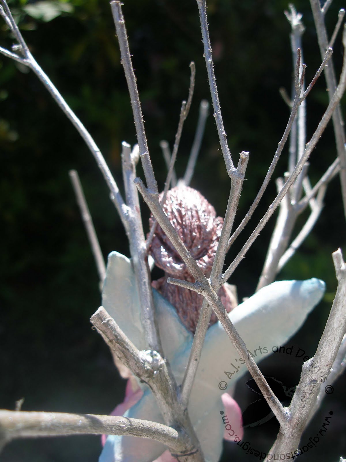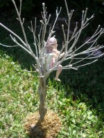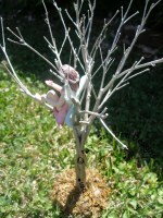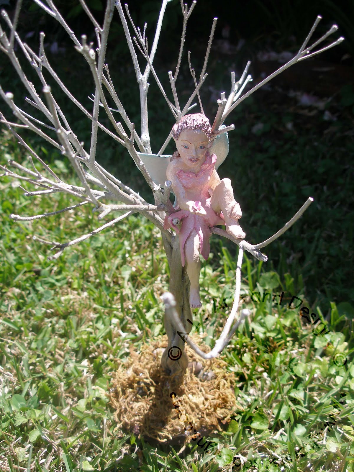 Since I have a Fairy Princess of my own, I asked her what I should make with my Paperclay. She of course said a Fairy! I was extremely skeptical when she suggested a fairy, but I figured why not? I knew my fairy needed something to sit on. At first I thought a mushroom out of Paperclay would work. I was drinking my coffee and looked out my window and saw the pot were the dead Rozalea bush and I knew that would be perfect for my fairy.