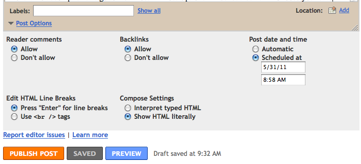 Now you can start adding your “pages” by adding posts to you blog. The most important item is to always have your “Welcome” Post be the latest date and the rest of the posts be a earlier date. For example: Your welcome date is today and your other posts are set to yesterday or a day earlier in the month. To accomplish this go to New Post –> Post Options –> Scheduled at –> Choose your date