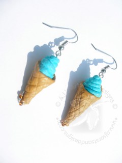9.) Paint the ice cream cones your favorite flavors (above photo: the right cone is what it should look like dried). Add the fish hook earrings (you may need pliers to open the loop). Trim any excess wire or add beads to the bottom of the cone.