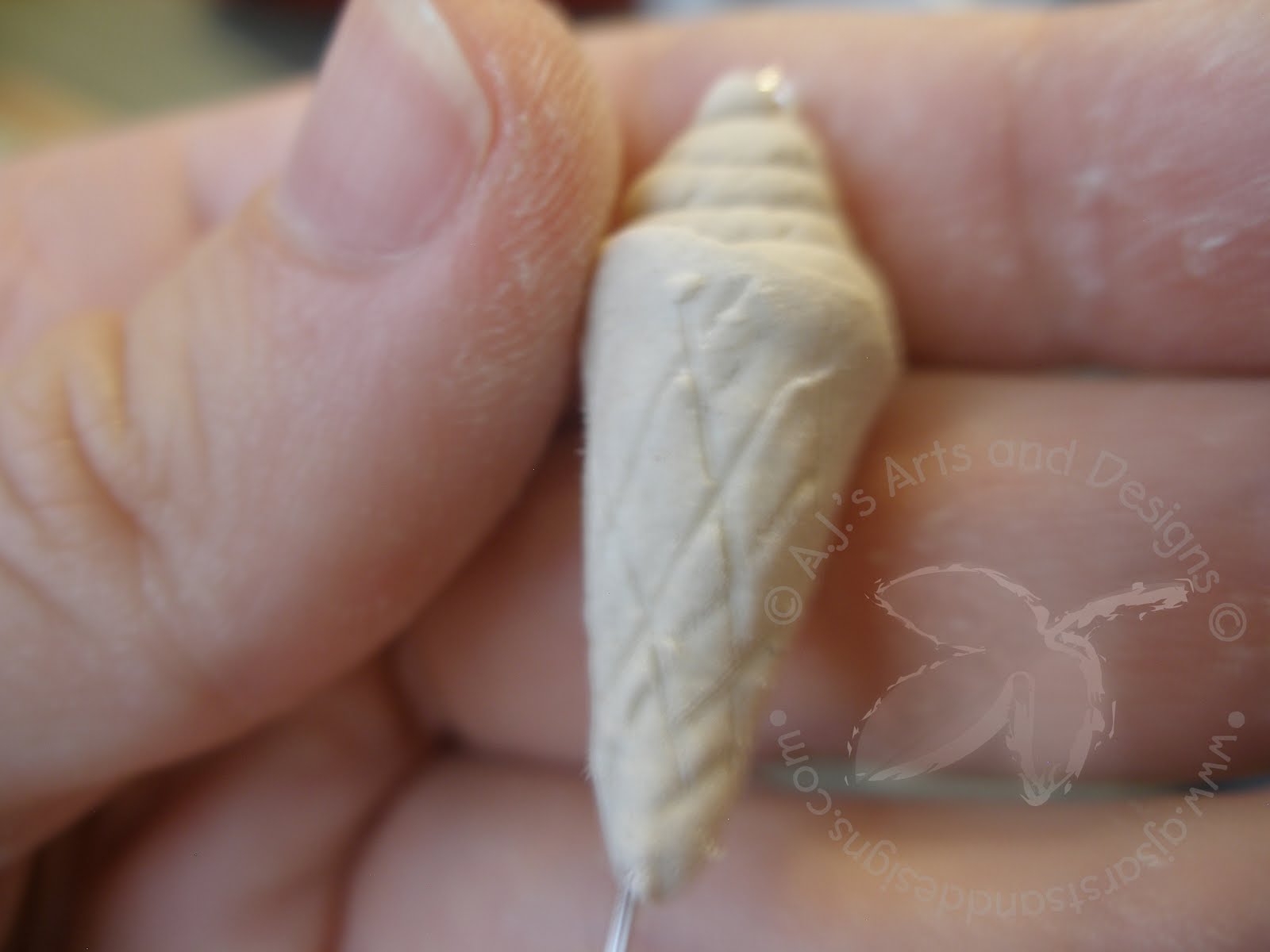 8.) Take your favorite sculpting tool and do a criss cross pattern on the cone. This pattern will will mimic the look of a waffle cone. Once this is finished let the cones dry 24 hours.