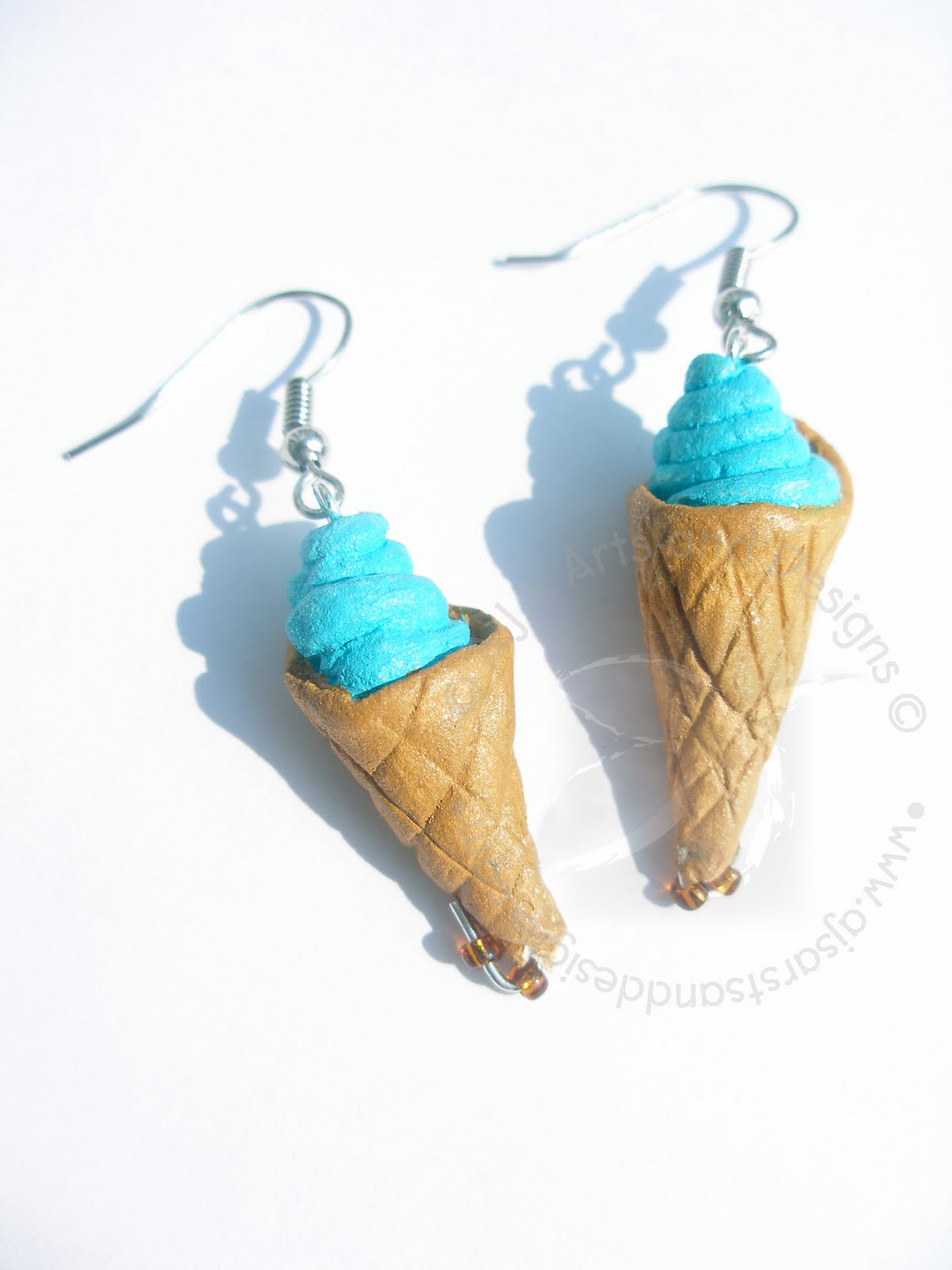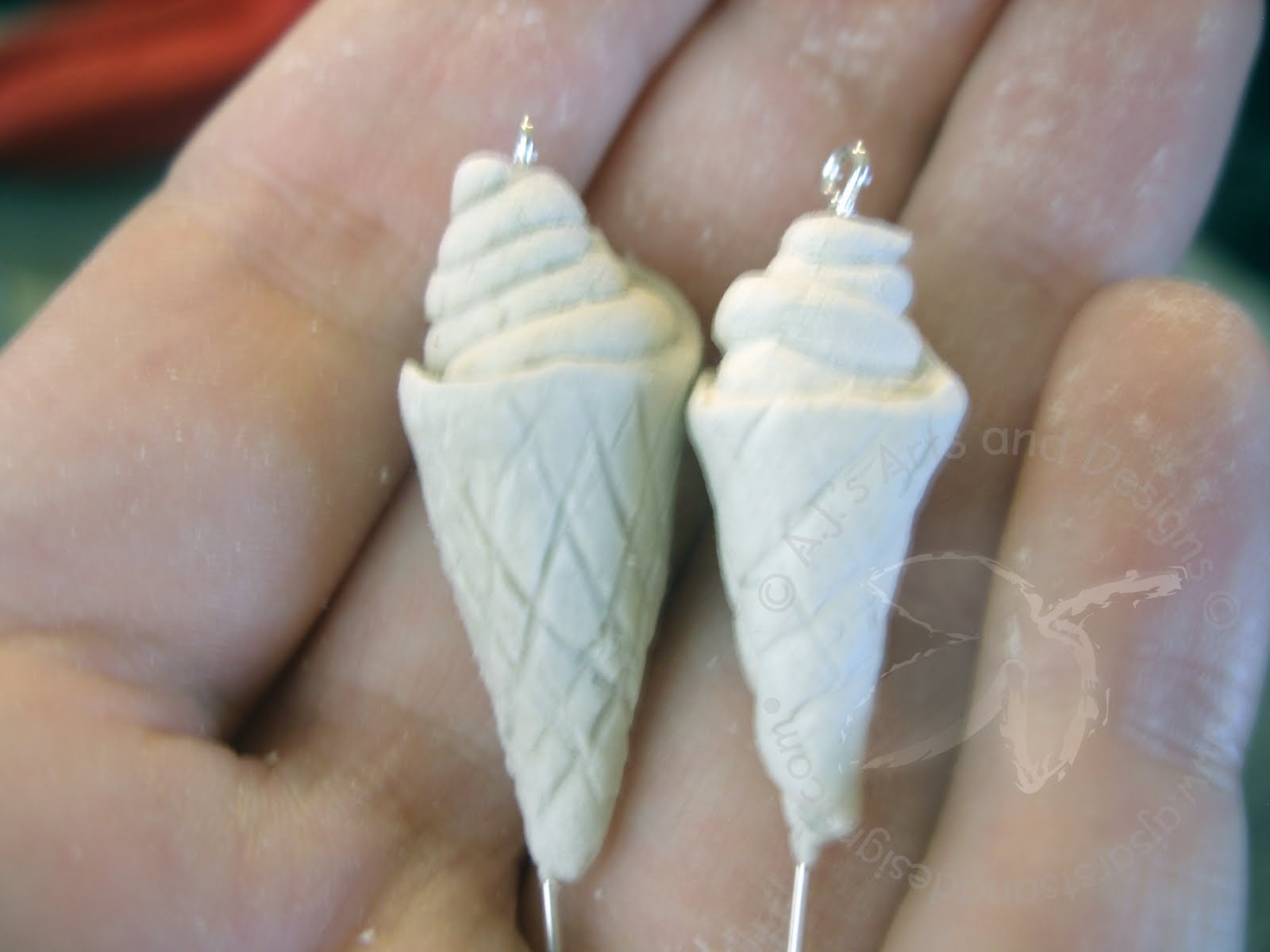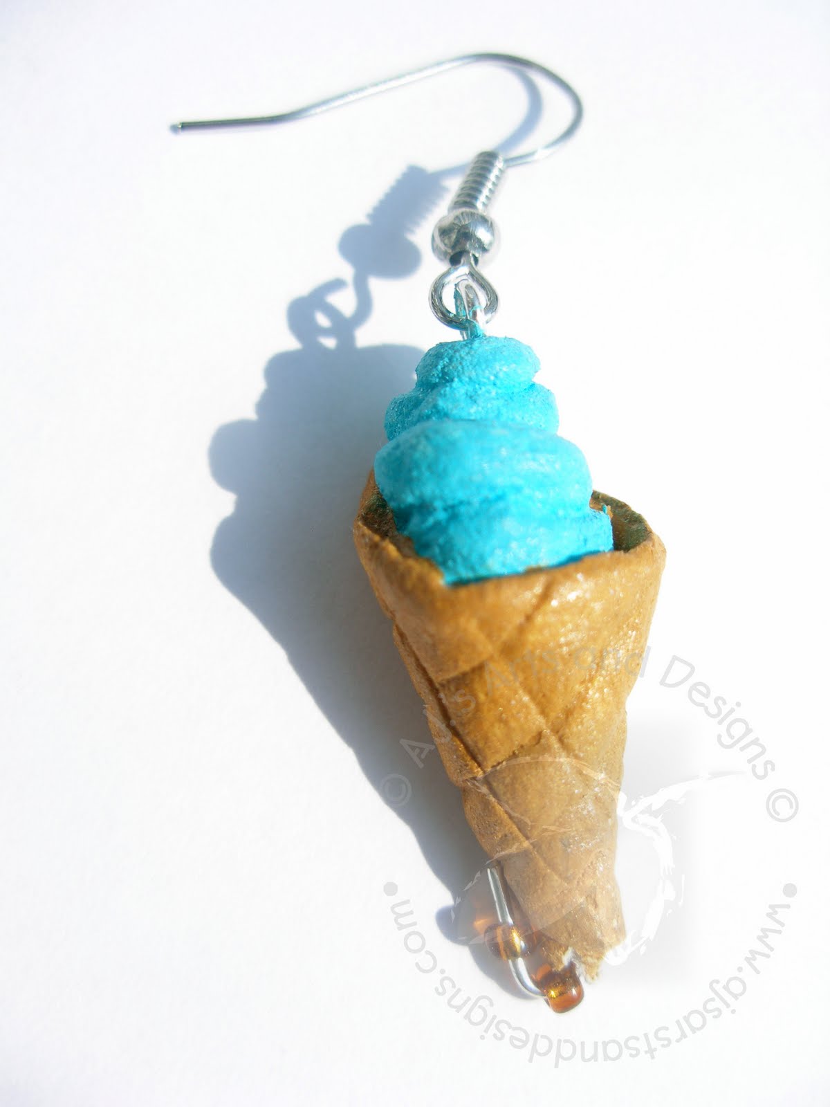 9.) Paint the ice cream cones your favorite flavors (above photo: the right cone is what it should look like dried). Add the fish hook earrings (you may need pliers to open the loop). Trim any excess wire or add beads to the bottom of the cone.