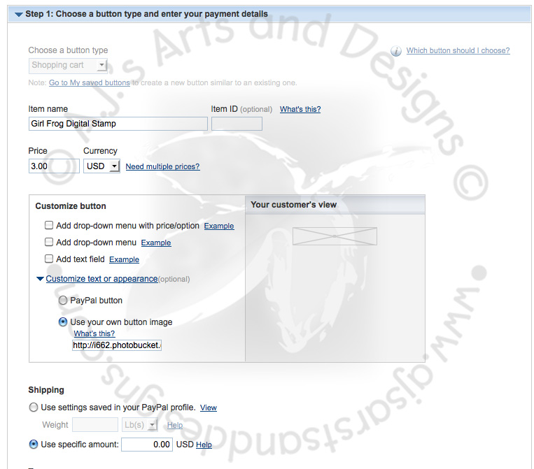 Another item I want to point out is if you want a “Custom Button” you will need to set up a Photobucket account and input the direct link (which I did for the Digi Shoppe.)