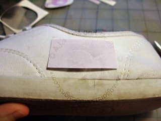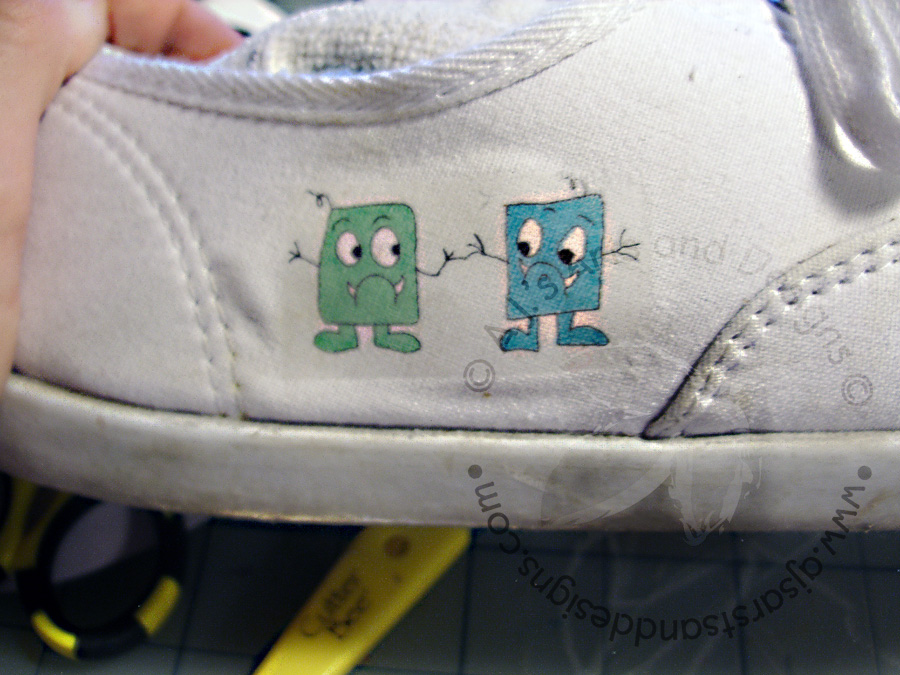 My shoes were (are) dirty and I really didn’t want to clean them (or buy new ones) before I did anything because I didn’t know if this would work. I printed off a couple of my Monster Digis and colored them with my Prismacolor Markers. The big challenge would be to get the canvas to stay put without burning myself with the iron.