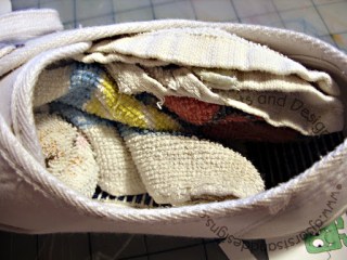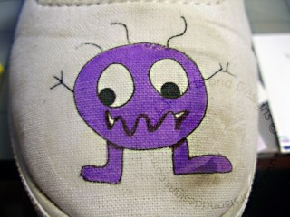 I love canvas shoes (you know the cheap canvas shoes you buy at Target or Wal-Mart) growing up I had a pair in every color (I still have a pair of dark green with Green Bay Packer Laces). They are extremely comfortable with my flat as a board feet. Over the years I have painted them with acrylic paints (they get crusty and flake), fabric paints (work well but they bleed), oil (not so much – St. Patrick’s Shoes) and puffy paint (my Halloween ones are Black and Black Light Paint Orange with Glow in the Dark Puffy Paint – awesome I know). My favorite pair I made was Tomato Canvas Soup Can Shoes that I wore out and plan on making them again. So I bought a pair of white shoes when my mom was here and has planned on painting them but I didn’t know what I wanted on them and how I wanted them painted. I left them and having a Booga, White Shoes DO NOT stay white for long.