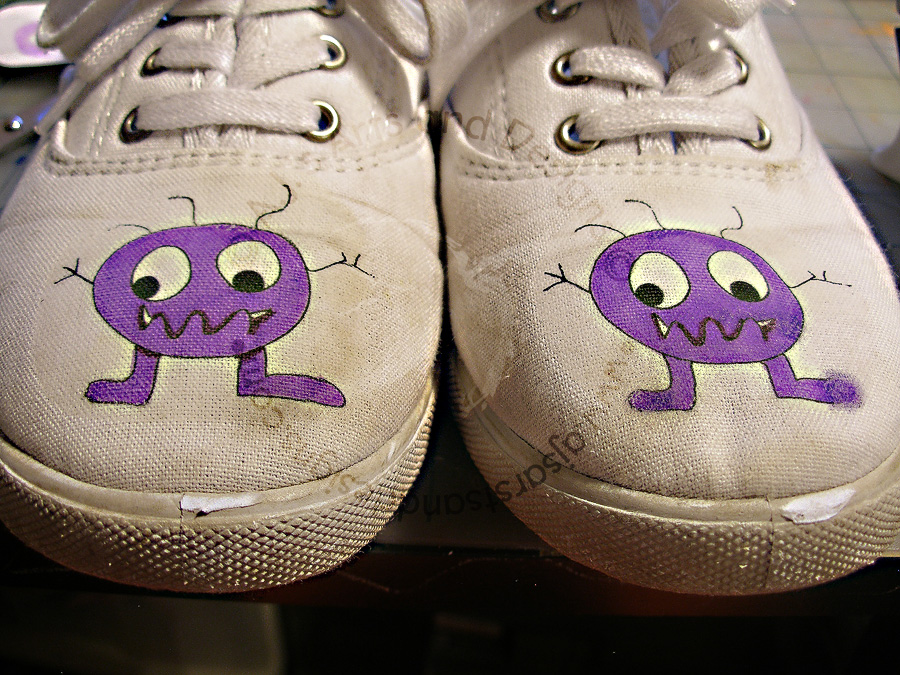 I pulled out the iron, the silicone release paper and in 10 seconds I had Monsters on the soles of my shoes. I am so excited and now I want to buy more cheap canvas shoes and put more of my digis on them. They are so cool – I think the next set might be a hodge-podge of Monsters or Little Brother Stamps.