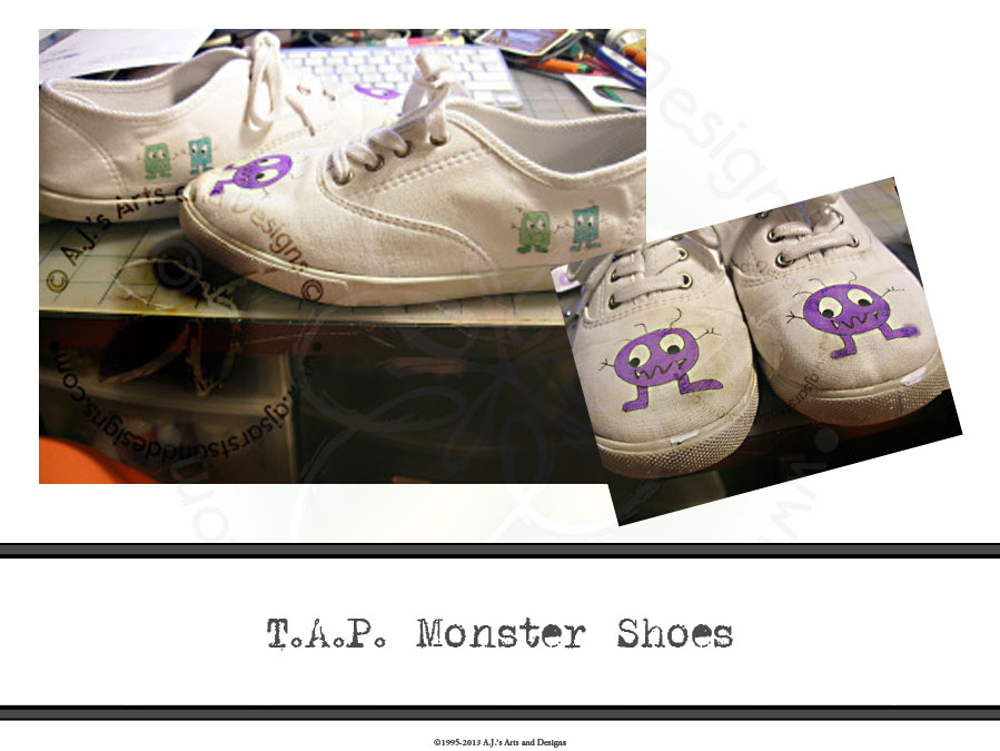 First I want to apologize to Paul Simon, I thought it was pretty clever. I received a pack of Lesley Riley’s TAP (Transfer Artist Paper) a couple months ago. Between my health and lack of color ink my printer it literally has stay in the package (Lisa Fulmer is cringing as she reads this) but I am happy to report I finally was made aware of the possibilities of TAP (no I have not been paying attention during all those TAP demos). I finally cracked open the package last week and read the directions – you can use artist quality markers, pencils, etc on it (i.e. Prismacolors) ROCK ON!!! I was so excited and knew what I wanted to do: Monsters on the soles of my shoes.