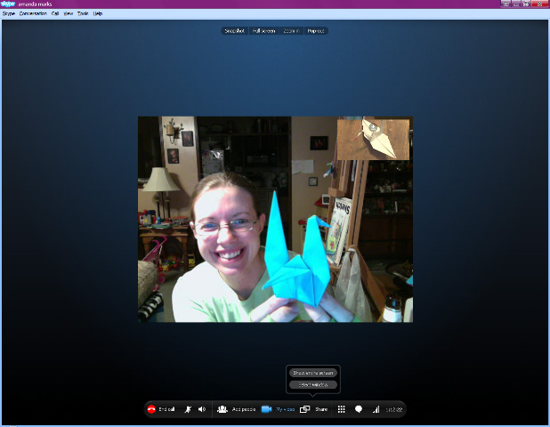 I admit (and have admitted) several times I hate origami. I have never been able to make a paper crane I get frustrated around the second boat and stop. My friend Leslie Rahye decided to teach me via Skype how to make a paper crane. These are screen shots she took of the process.