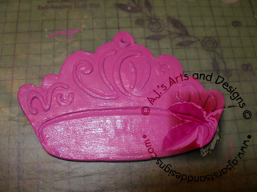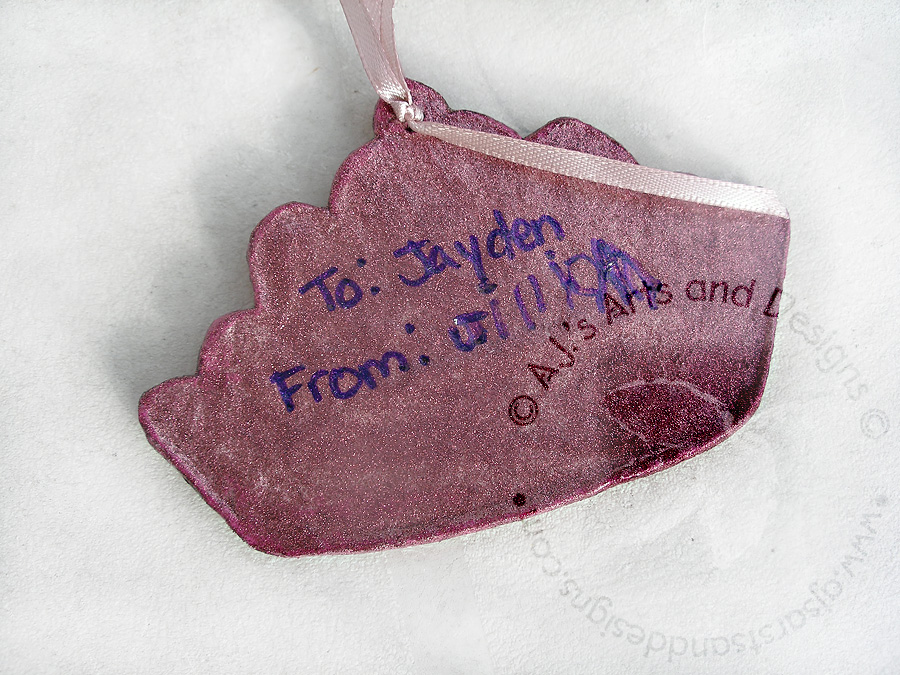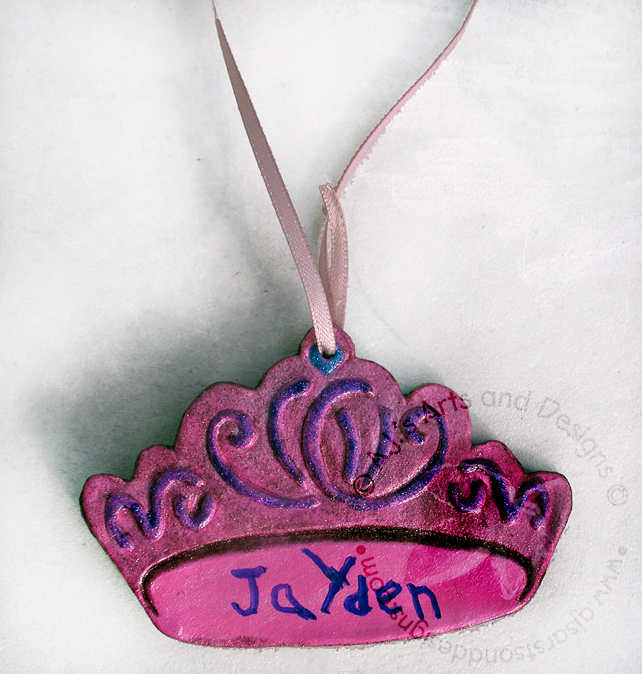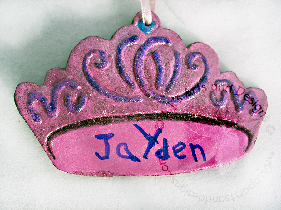 6.  Paint – we used Liquitex Iridescent Medium and Liquitex Soft Body Pink Paint for a base, then used Extreme Glitter to add the appropriate bling for a princess.  I let my daughter write her friend’s name on the front and a To: From: and the date on the back.  Seal with a sealant.  Add ribbon for hanging.