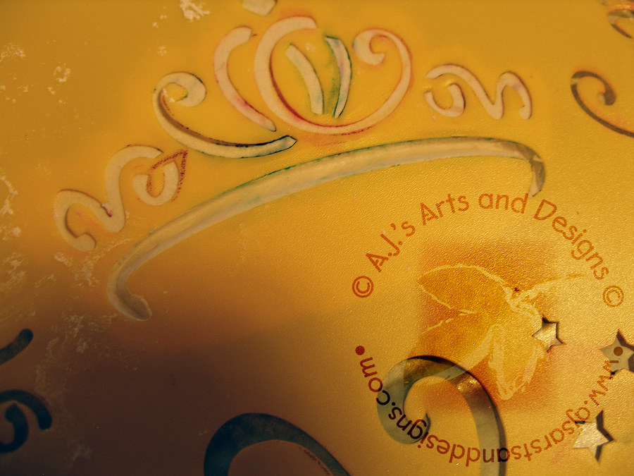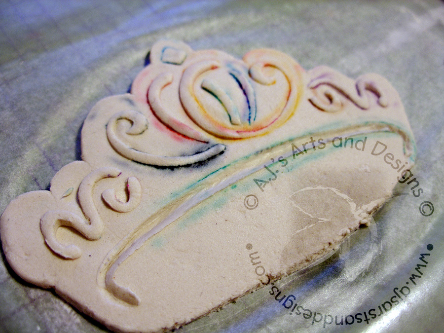 My daughter was invited to a “Princess Themed” Birthday Party a couple of weekends ago.  I always try and do something handmade for the kids.  I honestly don’t know how many people really appreciate this but I know if my child got something like this I would cherish it.  My daughter has a Princess stencil (cheap plastic wall stencil) that had a good size crown on it about 4″ width.  I decided I had to make a gift tag/ornament for my daughter’s friend with my daughter’s help of course.