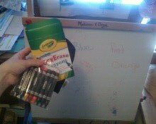 I went to Wal-mart yesterday with the Booga and picked up ONE set to try. They were either going to be the greatest thing in the world or they were going to be crap. I got them home and switch our easel around from the chalkboard side to the dry erase side. The kids were both extremely interested in what I was doing. I first wrote on the white board with the crayons to see how they worked. They worked great they glided onto the white board without having to push hard (scratching the white board surface) and they were solid enough that they did not turn to mush. The next test was to see how easily the crayon was removed from the white board. I did use the black mitt provided in the box and rubbed (not to hard) the crayon off – I was sold.