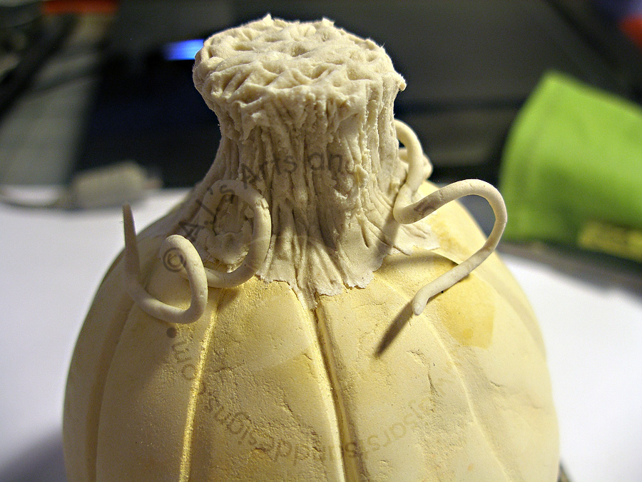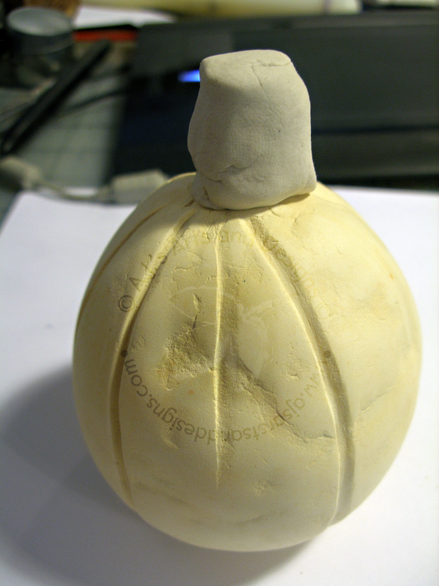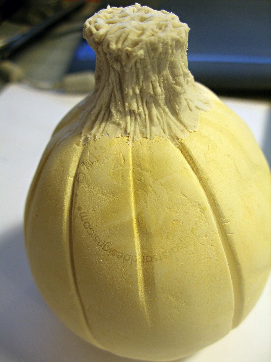 The stem was a lump of clay that I pushed onto the pumpkin and created lines with a sculpting tool.
