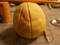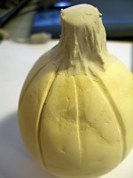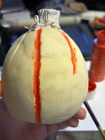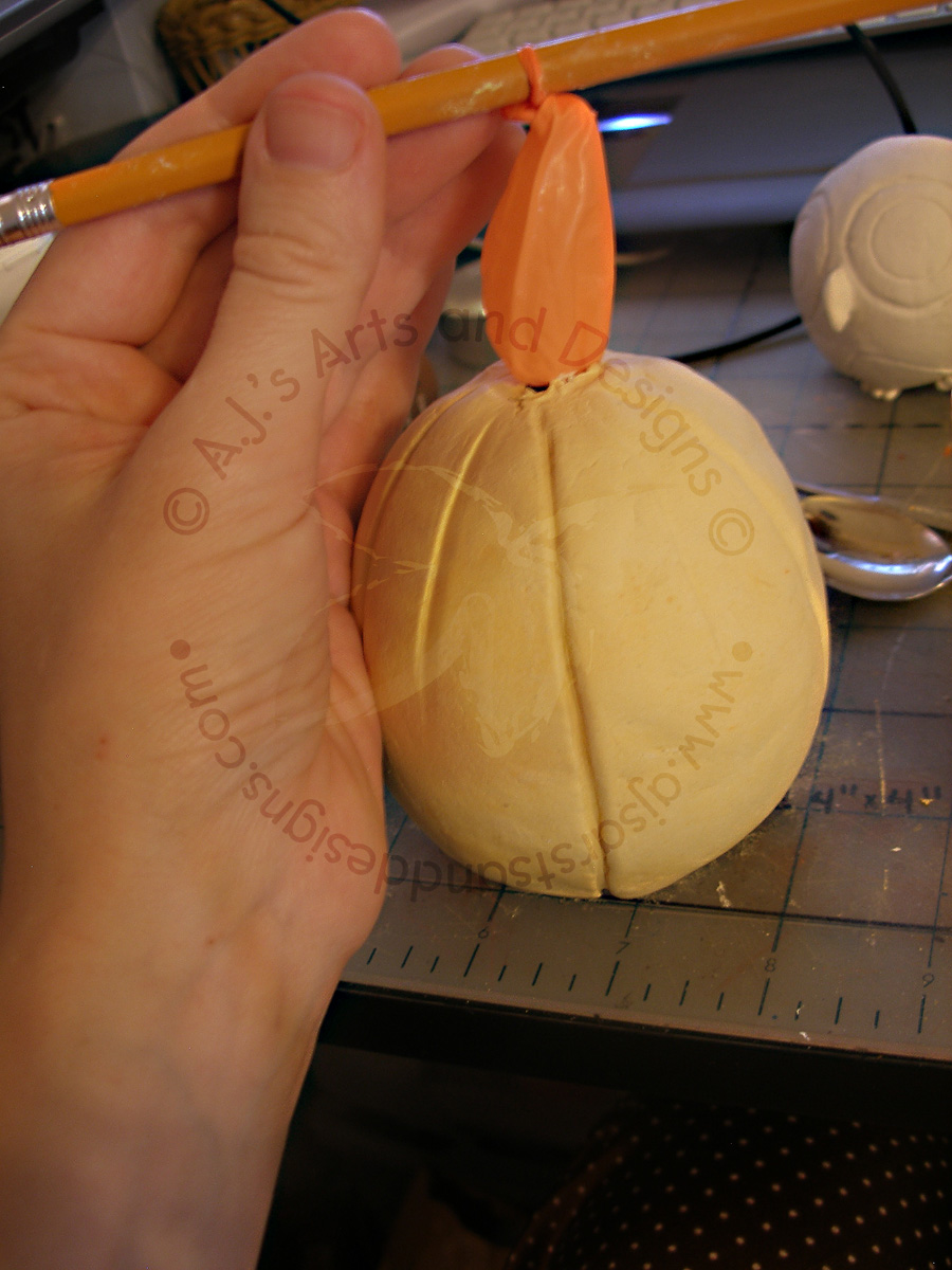 4. Add lines with a sculpting tool. Taking water smooth out the lines to make the lines more refined. Once the pumpkin is to your liking sit it standing up (you may have to gently push on the pumpkin to flatten the bottom) and let dry for 8-12 hours (it has to be dry enough to pop the balloon and not have it collapse onto itself).