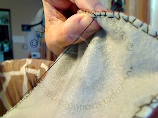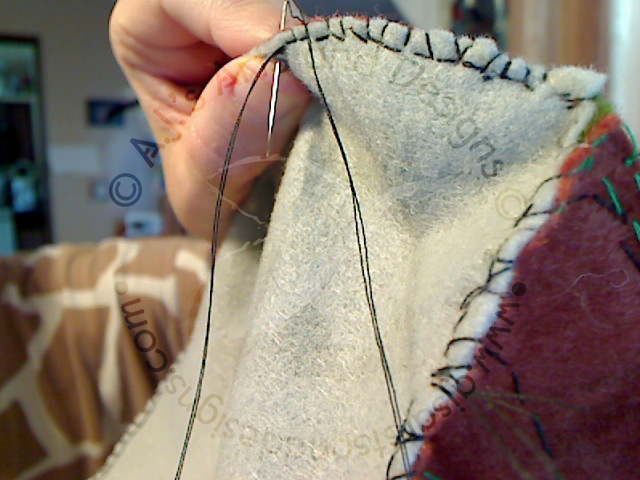 6. Using a blanket stitch (tutorial here – I did a “backwards blanket stitch” I always do a blanket stitch wrong). You could also use a sewing machine to do this step. I sewed everything together leaving a space at the bottom to turn the train right side out.