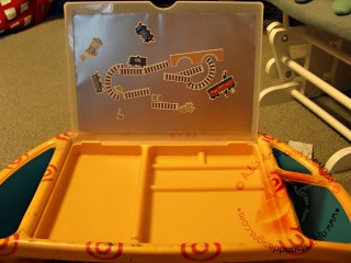 We bought a travel table back in 2009 we went on a road trip to New Jersey and my daughter complained she could not color very well. We got her the “Target Table” for our trek home. I love the table I used it when I was on bed rest with Booga, I use(d) it to raise items up to be closer to the camera during my show and of course for meals. I asked my daughter if there was anything she wanted me to do with the Target Table and she said, “I want it magnetic” Being completely dumbfounded I decided to think about it — how in the world could I make the table magnetic? I decided against paint because I couldn’t have the table out of commission for that long and the reviews I read are only so-so. I decided to look at the Dollar Store for something I could use to make the table magnetic. I found a cookie sheet and decided that it would be perfect for my needs and I also didn’t feel bad cutting it up because it cost a dollar. Booga also got some Thomas stickers for his birthday that I decided to make into magnets because I didn’t want Thomas stickers all over my walls and furniture.Materials Needed for Magnets:Old Magnets (our phone books come with magnets – my stash is running out)