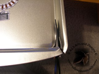 | Look how awesome my Tim Holtz Scissors are – they cut through metal! I trimmed the edge of the cookie sheet off so it would lay flat. |