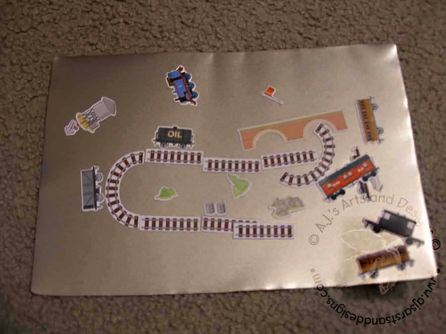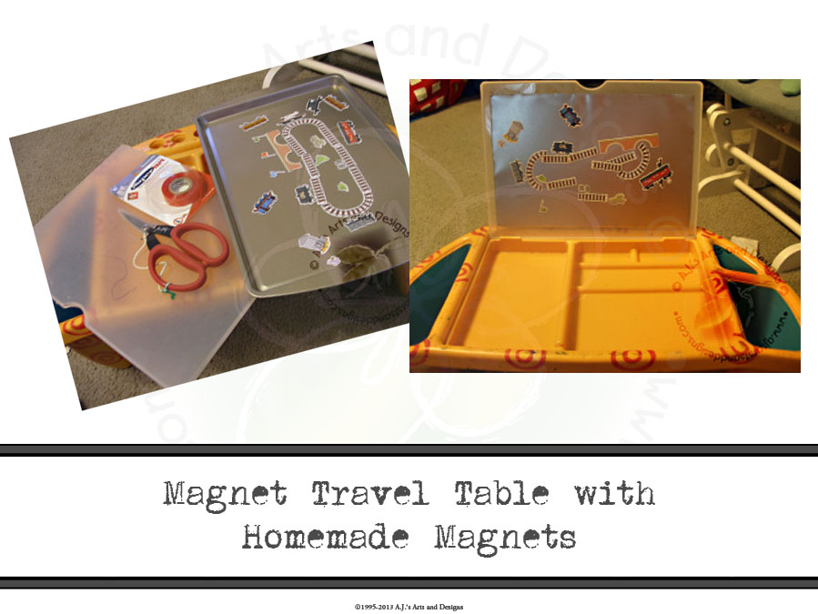 We bought a travel table back in 2009 we went on a road trip to New Jersey and my daughter complained she could not color very well. We got her the “Target Table” for our trek home. I love the table I used it when I was on bed rest with Booga, I use(d) it to raise items up to be closer to the camera during my show and of course for meals. I asked my daughter if there was anything she wanted me to do with the Target Table and she said, “I want it magnetic” Being completely dumbfounded I decided to think about it — how in the world could I make the table magnetic? I decided against paint because I couldn’t have the table out of commission for that long and the reviews I read are only so-so. I decided to look at the Dollar Store for something I could use to make the table magnetic. I found a cookie sheet and decided that it would be perfect for my needs and I also didn’t feel bad cutting it up because it cost a dollar. Booga also got some Thomas stickers for his birthday that I decided to make into magnets because I didn’t want Thomas stickers all over my walls and furniture.Materials Needed for Magnets:Old Magnets (our phone books come with magnets – my stash is running out)