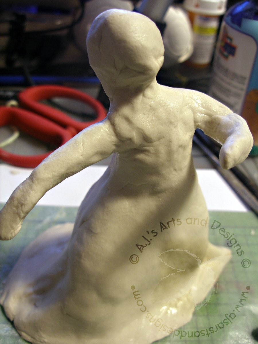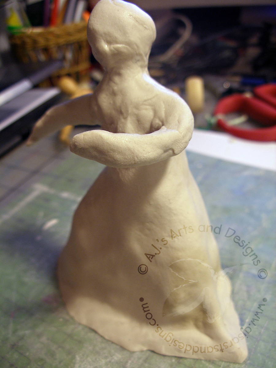 I started with a Wire Armature that I wrapped with tinfoil. It was also critical that she stand by herself so I constructed the base in that manner. As I show in the video I rolled out the clay to a uniform thickness and started cover the tinfoil with the Paperclay.