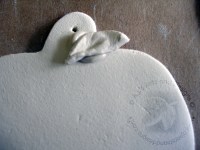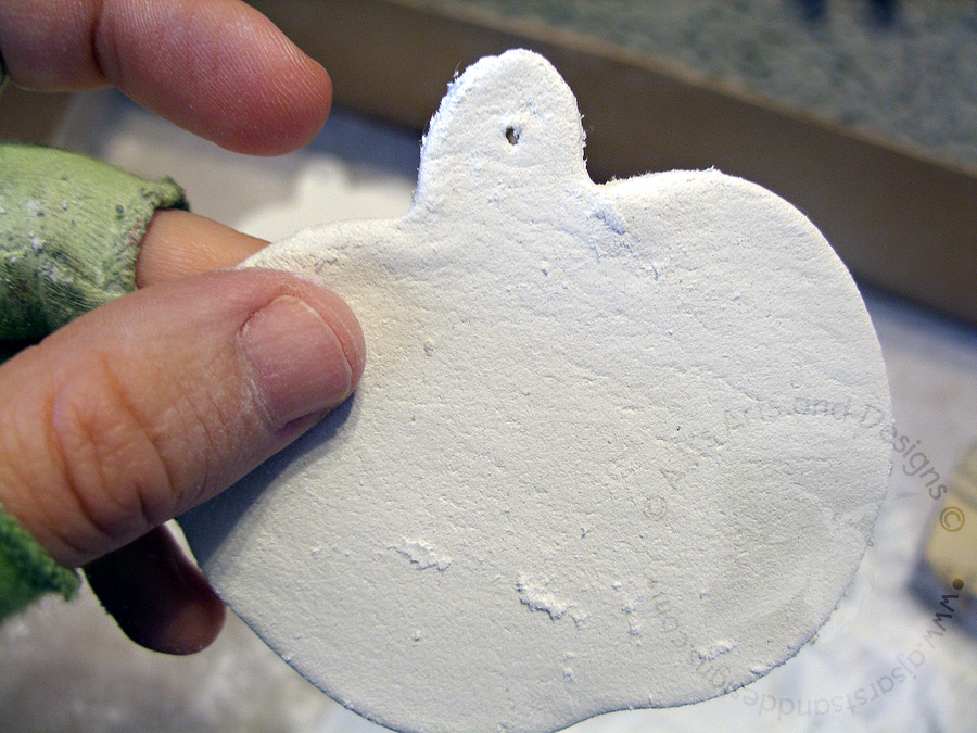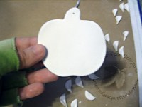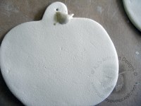 4. Take leaf and apply with slip onto the apple. Allow to dry. Stamp the tags for the ornaments.
