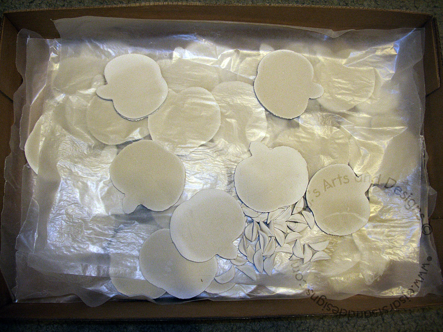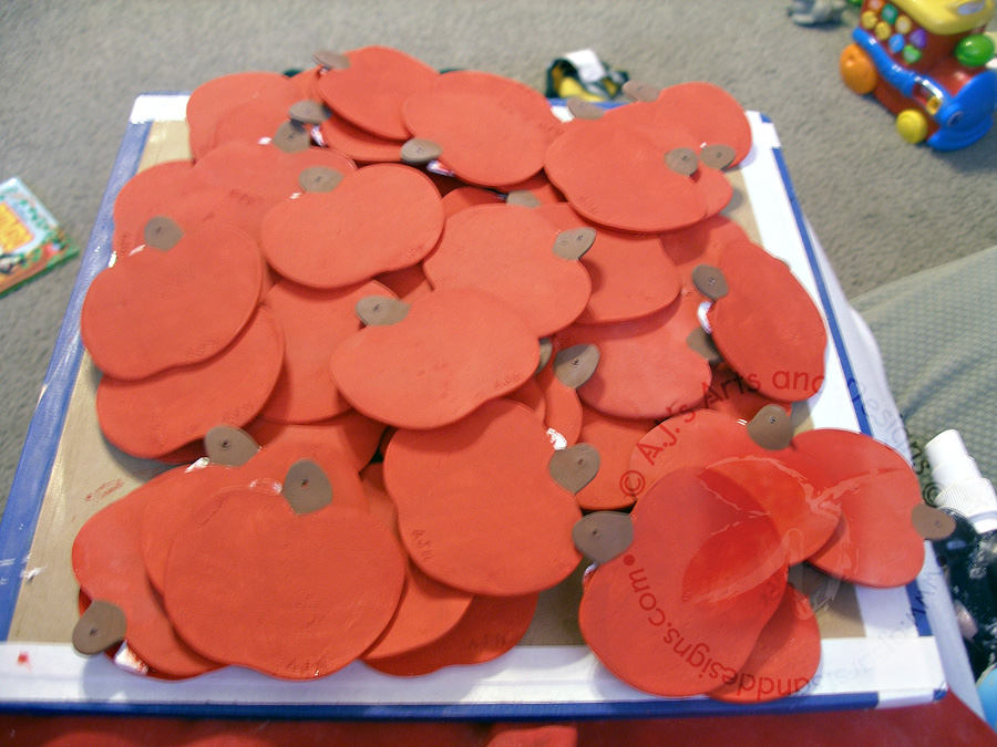 1. Take clay and roll it out with fondant roller to a uniform thickness. Using the cookie cutter cut out apples (repeat as many times as necessary until desired number has been reached.)