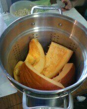 I also kept the steam water for vegetable broth – I have already cooked rice with it and plan on using it in my holiday cooking as my vegetable broth. The gooey innards of the pumpkin we used in soup base that ended up being pumpkin risotto (very good) because I added to much rice. I made pie number one (see photo) and it lasted maybe a day. I plan on trying to make the pie filling in the crock pot because neither of my kids really like the crust. Of course we roasted pumpkin seeds which the princess loves but Booga is not a huge fan of.