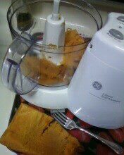I put 12 cups of water in the bottom and placed the pumpkin filled steam basket in there and steamed for 45 minutes. I let the pumpkin cool a little (because steaming hot pumpkin is REALLY HOT!) and scooped everything into the food processor and blended. I was shocked on how much pumpkin we now have. A Libby’s® can of Pumpkin is 15oz or 1 3/4cup of pumpkin. I split mine up into 1 3/4 cup of pumpkin and froze it. I got 4 “cans” in the freezer, I used 1 can for a pie (which lasted maybe 24 hours) and Booga pretty much ate another can.