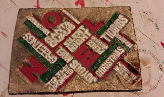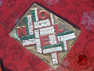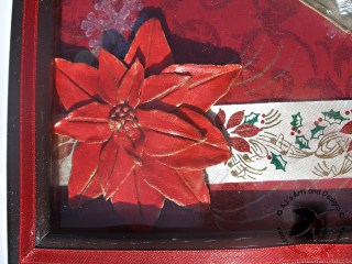 7. Add ribbon and music notes with the mica powder. Using a gold string I attached the stamped piece to the background. Using Tacky Glue® everything else was mounted together.