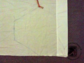4. Move the template to the edge of the pillowcase (then you won’t have to hem that side). Take a piece of chalk, trace the template and cut out. Cut out the straps, center piece and ruffles.