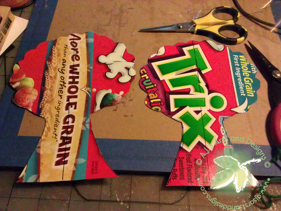 Trace the trees onto the paper (you will need four bushes and four trunks). Glue the paper onto the cereal boxes, add ink onto edges to hide the cardboard.