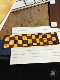 I cut stripes 1/4″ wide and added Walnut Stain to the strips.