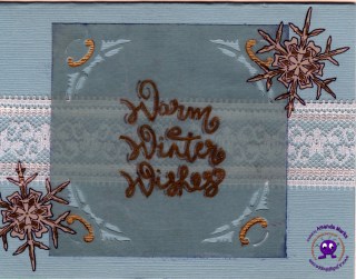 Paper: The card is blank 5 1/2″ x 4″ made from light blue card stock. The vellum was punched with a Purple Cows® Winter Punch It.  Close to my Heart – Warm Winter Wishes Stamp, Brown Staz-on Ink