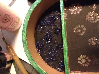 Add black paper to the center. The top was created with adding Purple Vinetage Glass Particles to 3D Crystal Lacquer. The Daisy were created by adding glue to a stamp and stamping the image, sprinkling Extra Fine Glitter over the top. The bottom portion was created by cutting up dried pieces (skins) of Terri Sproul Mixers and 3D Lacquer, to create a mosaic look.