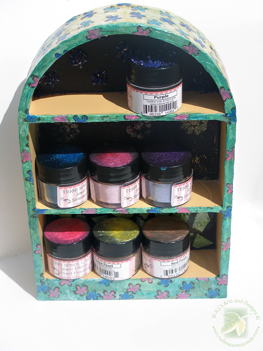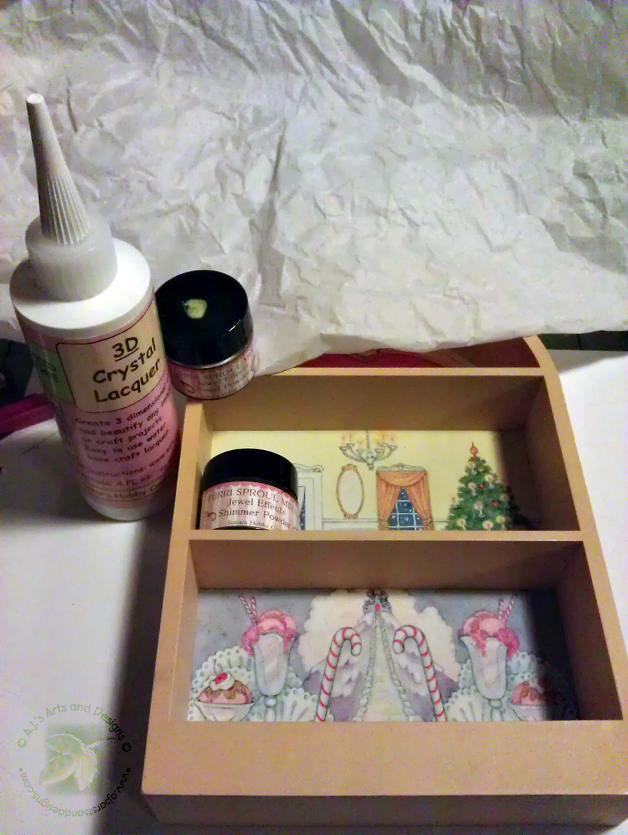 My grandmother sent me this shelf over a year ago and I decided it needed a revamp in order to stay. I decided to use my 3D Crystal Lacquer and Terri Sproul Mixers over tissue paper to create this revamped look.