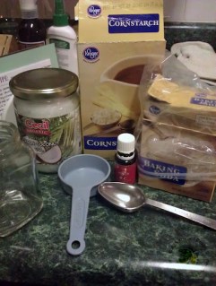 | Ingredients : 1/4 Cup Baking Soda 1/4 Cup Corn Starch 5-6TBSP Coconut Oil Essential Oil (Optional) |