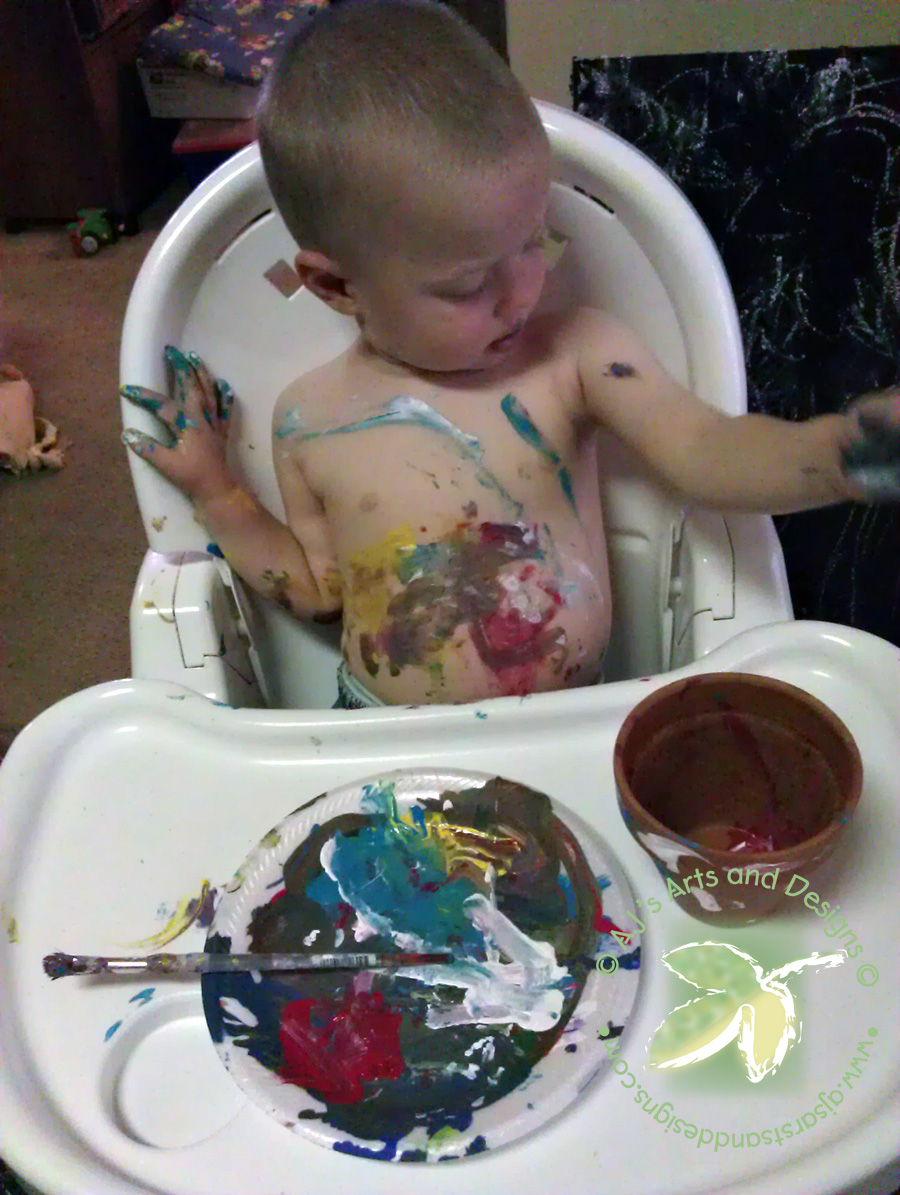 | Booga got tired of painting the pot and decided painting his tummy was so much better. |