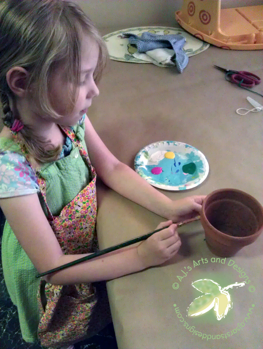 Pin ItYesterday I decided to let the kids paint (I blame the Sudaphed) I covered the table and figured why not. I went out to the garage and found some Terra Cotta Pots one for each child and decided to let them at the pots with the paint.