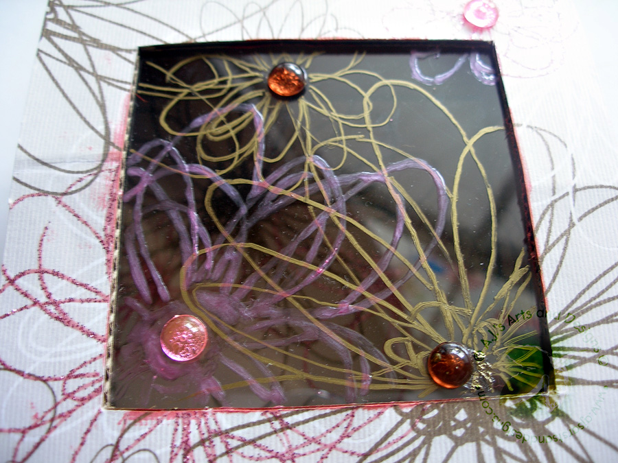 My project is a very simple decoupage gift/jewelry box in which I used Robin’s Nest Gold Daisy/Striped Paper (double-sided) to a simple cardboard box (I pulled out of the recycle bin).  I cut out a 2″x2″ square window for the scrap of acrylic I had from a previous project.  I added the daisy side of the paper to the top of the box and the striped side of the paper for the outside of the box.  My embellishments were Dew Drops and a Rub-on.  I did raw the extension of the daisy petals on the acrylic with a gold paint marker and I painted the pink with 3D Crystal Lacquer and Terri Sproul Mixers.  A nice simple project that is just in time for Mother’s Day (mom don’t look).